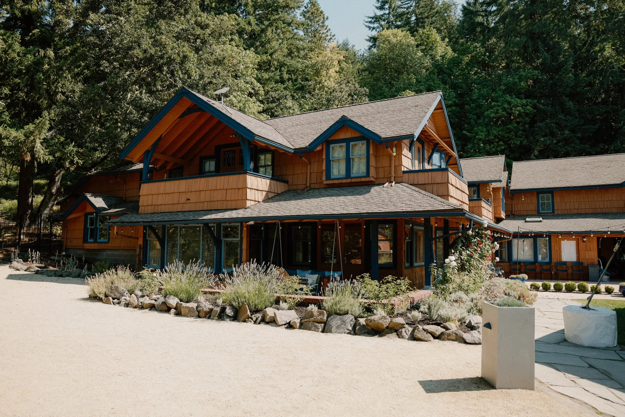 The Mount Tom property got another makeover when Pauli Polumbo acquired the house in the 1990s. She turned her attention toward the property’s landscaping and added elaborate rock terraces and two spring-fed ponds. Additionally, she established the Flying Wyrm conservation easement in partnership with the McKenzie River Trust. This 140-acre nature conservancy protects the trees and wildlife behind the house and maintains hiking trails that were once logging roads.