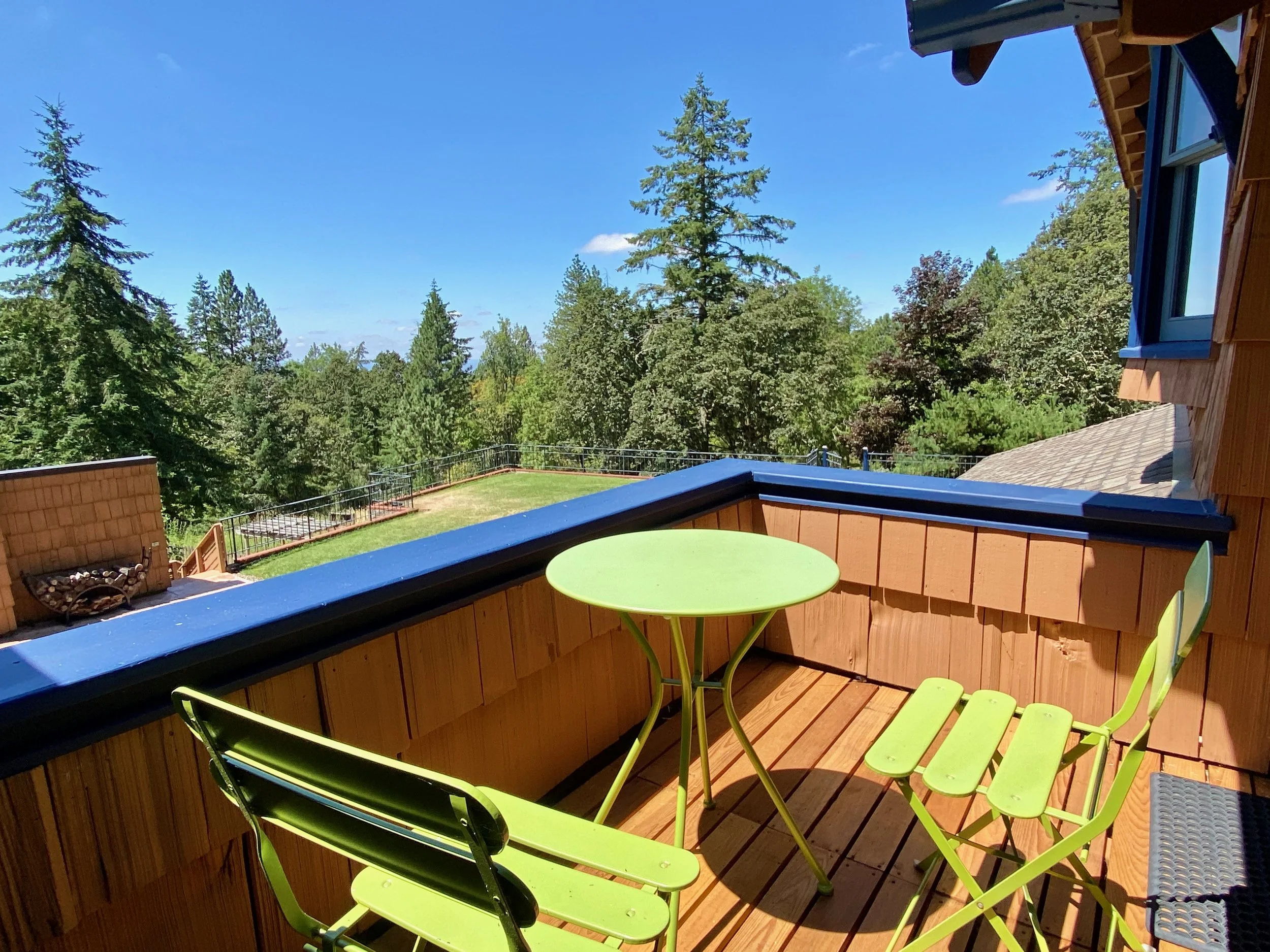 Not lacking in cozy vibes, this room arguably has the best views of the summer sunset that you can watch from its queen bed or private balcony. Its detached private bathroom has a 70s tile flare adding more fun & interest.